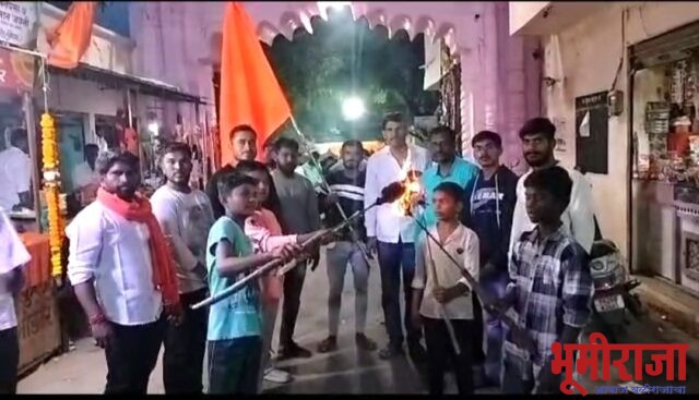 वाढोणा( हिमायतनगर शहरात आज सायंकाळी बजरंग दल तर्फे श्री परमेश्वर मंदिर येथून भव्य मशाल रॅली काढून शहरातील मुख्य रस्त्याने फिरून बाजारातील मारोती मंदिरास प्रदक्षिणा मारून या भव्य मशाल रॅलीचा समारोप करण्यायत आला भव्य रॅलीत नवतरुण बजरंगींचा उत्साह गगन भेदी श्रीराम च्या घोषणा व देश का बल बजरंग दल या आवाजाने वाढोणा शहर दुमदुमले