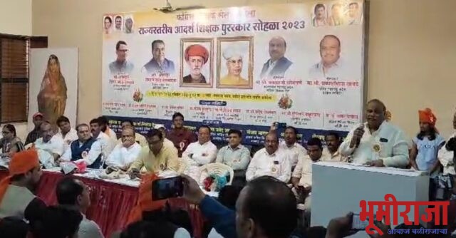 दिनांक 5 नोव्हेंबर 2023 रोजी *स्वराज्य भवन* अकोला येथे सोहळा मान्यवरांच्या हस्ते संपन्न झाला राज्यातील 43 शिक्षकांची पुरस्कारासाठी निवड करण्यात आली होती कार्यक्रमाला प्रमुख अतिथी म्हणून अमरावती विभागाचे शिक्षक आमदार मा.श्री किरण दादा सरनाईक साहेब , अमरावती विभाग पदवीधर मतदार संघाचे आमदार मा. धिरज भाऊ लिंगाडे साहेब , मार्गदर्शक प्रकाशभाऊ तायडे सचिव महाराष्ट्र प्रदेश काँग्रेस कमिटी ,मा. प्रकाशजी सोनवणे प्रदेशाध्यक्ष महाराष्ट्र प्रदेश काँग्रेस शिक्षक सेल ,अमीत बोबडे अध्यक्ष अमरावती विभाग श्री अमर पाटील अध्यक्ष कोकण विभाग मा.साजिद खान पठाण विरोधी पक्षनेता अकोला, श्री अशोक अमानकर ग्रामीण जिल्हाध्यक्ष काँग्रेस कमिटी अकोला, डॉ.प्रशांत पाटील वानखडे अध्यक्ष अकोला महानगर काँग्रेस कमिटी प्रदीप शेवतकर अध्यक्ष अमरावती शहर , सुधाकर वाहूरवाघ विभागीय उपाध्यक्ष, सौ. पुष्पा गुलवाडे महिला पदाधिकारी कॉंग्रेस कमिटी ,सुभाष भाऊ सातव राष्ट्रीय सरचिटणीस अखिल भारतीय माळी महासंघ अॅड. प्रकाशजी दाते अध्यक्ष अकोला अखिल भारतीय माळी महासंघ ,फैयाज खान , सरफराज खान , हसन कामन वाले , दिनेश तायडे सर ,गणेशराव काळपांडे , मनोहर उगले ,पंकज वाढवे, इ. प्रमुख अतिथी उपस्थित होते. शैक्षणिक व सामाजिक क्षेत्रात उल्लेखनिय कार्य केलेल्या शिक्षकांचा परंतू शासनाच्या निकषातून राहीलेल्या शिक्षकांचा सन्मान आम्ही काँग्रेस शिक्षक सेल अकोला मार्फत गेल्या राज्यस्तरीय आदर्श शिक्षक पुरस्कार देऊन यथोचित सन्मान करतो. असे प्रतिपादन मा. प्रकाशभाऊ तायडे यांनी केले. आदर्श शिक्षक पुरस्कार म्हणून संपूर्ण महाराष्ट्रातील मुंबई