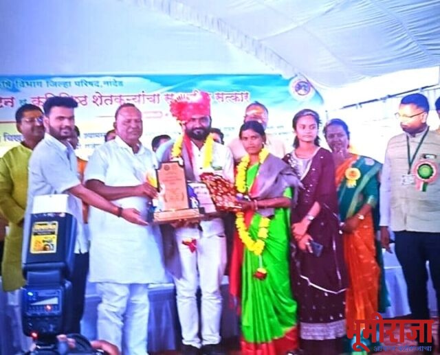 जि. प. उपकर योजने अंतर्गत दि. 10/1/2024 रोजी माळेगाव येथील यात्रा महोत्सवाच्या अनुषंगाने घेण्यात आलेल्या शेतकरी उपकर योजनेत हिमायतनगर तालुक्यातील करंजी या छोट्याशा गावातील अल्पभूधारक शेतकरी श्री संजय बळवंतराव चाभरकर यांनी आपल्या आपार कष्टातून अवघ्या सात एकर जमिनीतून शासनाच्या विविध योजना राबवत अनेक पिकांवर यशस्वी शेती करुन आज पर्यंत शासनाचे अनेक पुरस्कार प्राप्त केले आसुन पुन्हा एकदा कृषिनिष्ठ पुरस्काराचे मानकरी ठरले आहेत. या सर्व परिश्रमात त्यांच्या आर्धांगीनि सौ. सुरेखाताई संजय चाभरकर यांचा मोलाचा वाटा आहे जेवणात व्हायच आसेल तर जोडीदार सोबतीला मजबुत असावा लागतो हे एक आदर्श या दांपत्यांनी दाखवुन दिला आहे फळबाग, शेततळे , रोपवाटिका, सिड प्लॉट, टोमॅटो, मोसंबी, पेरू, हळद, टरबुज, अश्या अनेक पिकातून भरपुर उत्पन्न घेत सदन शेतकरी म्हणुन तालुक्यासह जिल्ह्लात बहुमान मिळवला असल्याने त्यांच्या या कामगिरीतुनतालुक्यात सर्वत्र त्यांचा शुभेच्छा देउन सत्कार होत आहे. युवा शेतकरी वर्गाला खुप काही शिकण्यासारखे आहे या वितरणाच्या वेळी उपस्थित….श्री.संदिप माळवदे सर (अति मुख्य कार्यकारी अधिकारी जि. प. नांदेड), श्री. विजय बेतीवार (मा.कृषी विकास अधिकारी जि. प. नांदेड ) श्री. सुमेध मांजरेकर (मे.गट विकास अधिकारी हिमायतनगर), श्री. जी .डी . भदेवाड (कृषी अधिकारी पं. स. हिमायतनगर श्री. उत्तम देशमुख (विस्तार अधिकारी पं. स. हिमायतनगर ….