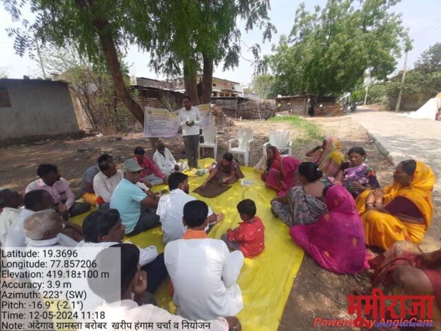 तालुका कृषी कार्यालय हिमायतनगर यांच्या सौजन्याने कृषी विभाग आपल्या शेतावर. खरीप हंगाम 2024 मोहीम अंतर्गत मौजे आंदेगाव येथे जिल्हा अधीक्षक कृषि अधिकारी भाऊसाहेब बऱ्हाटे साहेब यांच्या मार्गदर्शनाखाली तालुका कृषी अधिकारी दिलीप जाधव साहेब, कृषि अधिकारी व पर्यवेक्षक काळे साहेब, मंडळ कृषी अधिकारी श्री. वानखेडे साहेब, कृषी सहाय्यक सौ. स्वाती ढगे मॅडम यांनी माती नमुने कसे घेणे, मागेल त्याला शेततळे, भाऊसाहेब फुंडकर फळबाग लागवड योजना, नाडेप, गांडूळ खत योजना, गोगलगाय निर्मूलन , सूक्ष्म अन्न प्रक्रिया उद्योग, सेंद्रिय शेती, एकात्मिक खत व्यवस्थापन, एकात्मिक कीड व्यवस्थापन, घरीच लिंबोळी अर्क तयार करणे, शेतकरी मासिकाचे फायदे, खरीप हंगाम साठी घरच्याच सोयाबीनची उगम क्षमता तपासून तेच बियाणे पेरणीसाठी वापरून शेतीवर होणारा खर्च कमी करणे. याविषयी सविस्तर माहिती देण्यात आली. तसेच गावातील नाल्याचे लोकसहभागातून खोलीकारण व सरळीकरणाचे काम करण्याकरिता गावकऱ्यांनी पुढाकार घेऊन 50000.00 रुपये जमा केले.